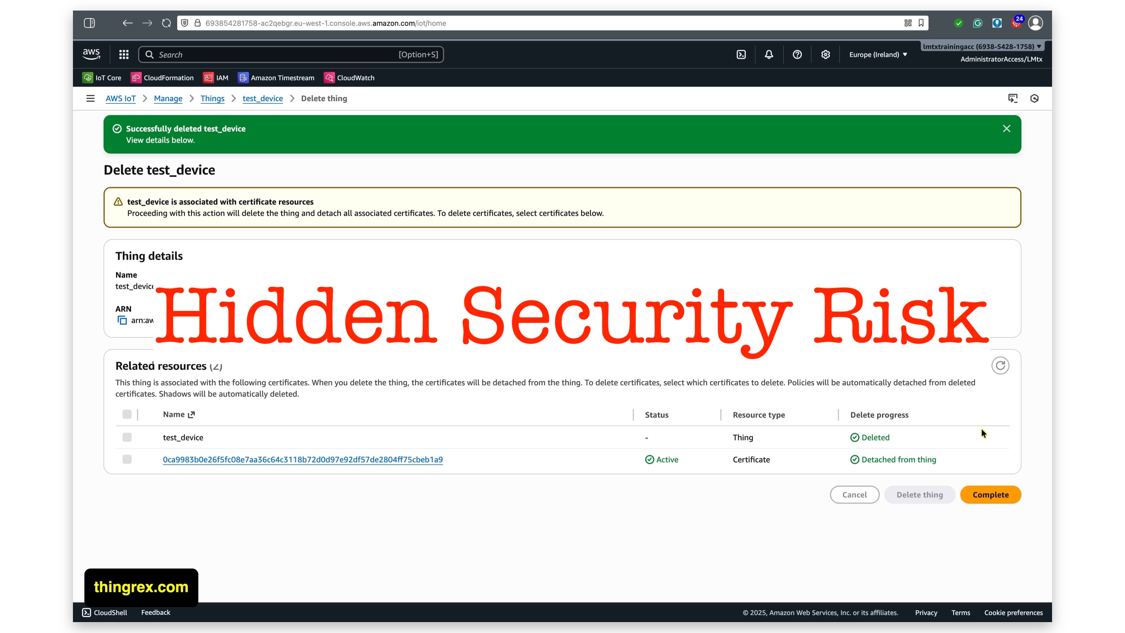 Here’s the thing: deleting an IoT Thing only removes the logical representation of your device. The certificate (your device’s proof of identity) remains active with policies attached.